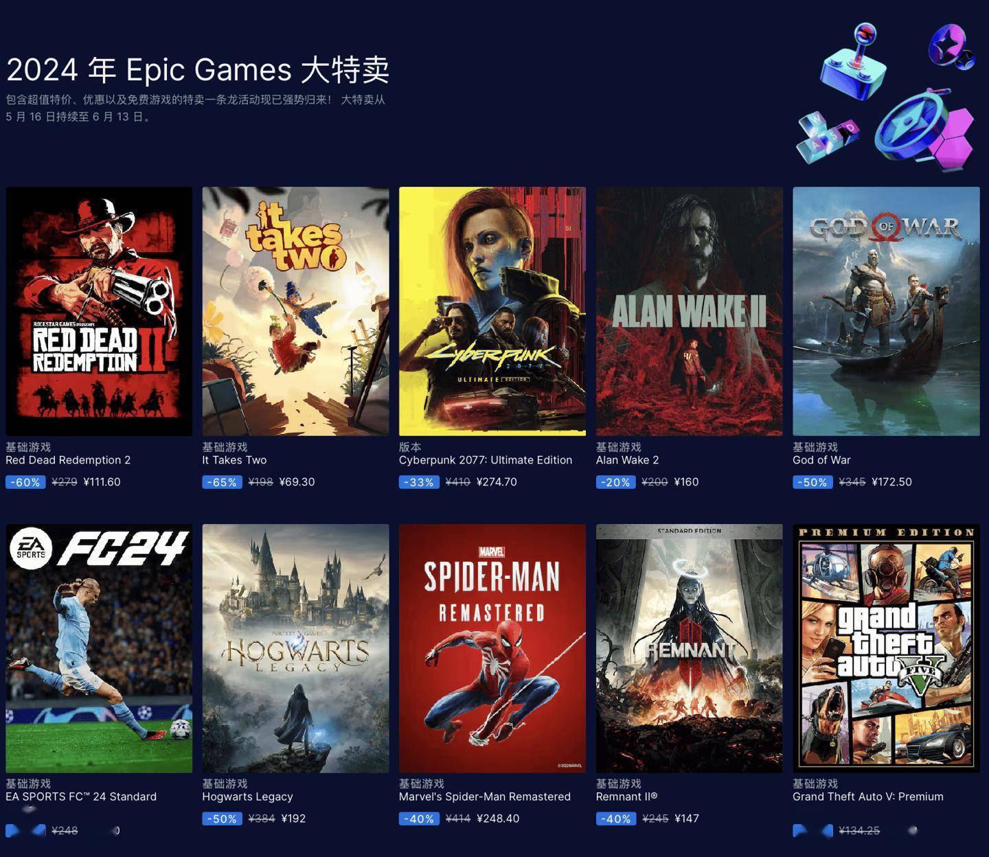 Epic游戏商城即日起开启2024年Epic Games大特卖(Epic Mega Sale)活动,相关活动从5月16日持续至6月13日,活动期间多款游戏迎来折扣,IT之家整理部分折扣游戏如下: - 《荒野大镖客:救赎2》:原价279元,4 折后111.6元