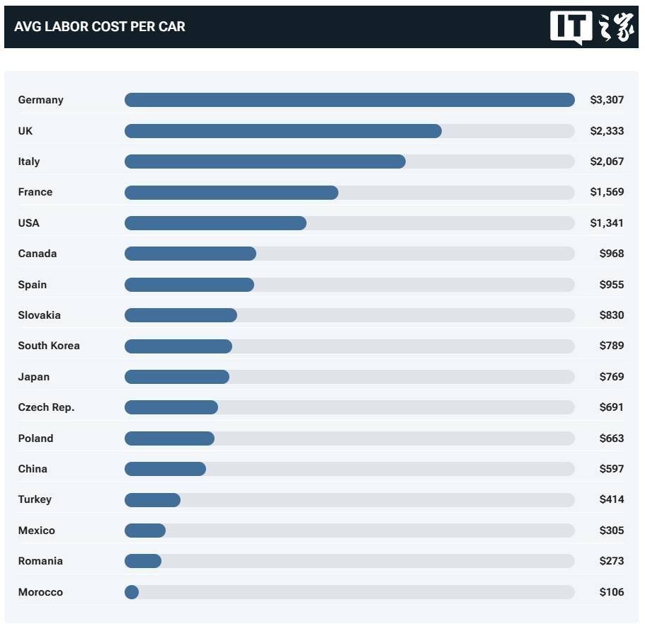 IT之家 5 月 11 日消息,随着特朗普总统的进口关税政策逐步生效,包括德国汽车制造商在内的众多外国车企正在考虑增加在美国本土的汽车生产。就奥迪而言,这将意味着其首次在美国建立生产基地。 然而,避免关税并非是车企将生产从德国转移至美国的唯一动因。德国国内高昂的劳动力成本,是压垮德国汽车产业的另一个主要因素。根据奥纬咨询(Oliver Wyman)的一项新研究,德国的汽车生产劳动力成本在全球范围内位居首位,这也是近年来德国本土汽车产量在过去十年间下降超过四分之一的重要原因,且这一趋势预计仍将持续。 该研究对全球 250 家汽车工厂进行了对比分析,结果显示,德国生产一辆新车的平均劳动力成本高达 3300 美元(IT之家注:现汇率约合 23899 元人民币),其中包括工资、养老金缴纳以及其他福利。若将生产转移至美国,这一成本将大幅降低超过一半。然而与在中国生产汽车相比,美国的劳动力成本仍显得较为高昂,中国生产一辆汽车的劳动力成本仅为 585 美元(现汇率约合 4237 元人民币),在某些情况下,在德国生产一辆汽车比在中国多出 7800 美元。 “未来我们如何才能继续维持德国的汽车生产,这确实是一个亟待解决的问题。”奥纬咨询德国负责人法比安・布兰特在接受德国《商报》采访时表示,“如果产量持续下降,许多中型供应商将不得不离开德国,甚至可能倒闭。” 不过,如果关税问题不再成为阻碍,而降低劳动力成本成为首要考量,那么相比中国,还有更好的建厂选择。该研究发现,墨西哥和罗马尼亚的劳动力成本甚至比中国还要低,墨西哥生产一辆汽车的劳动力成本仅为 305 美元,罗马尼亚则为 273 美元。而最低的国家是摩洛哥,在这里生产一辆汽车的劳动力成本仅为 106 美元(现汇率约合 768 元人民币),不到德国成本的三十分之一。