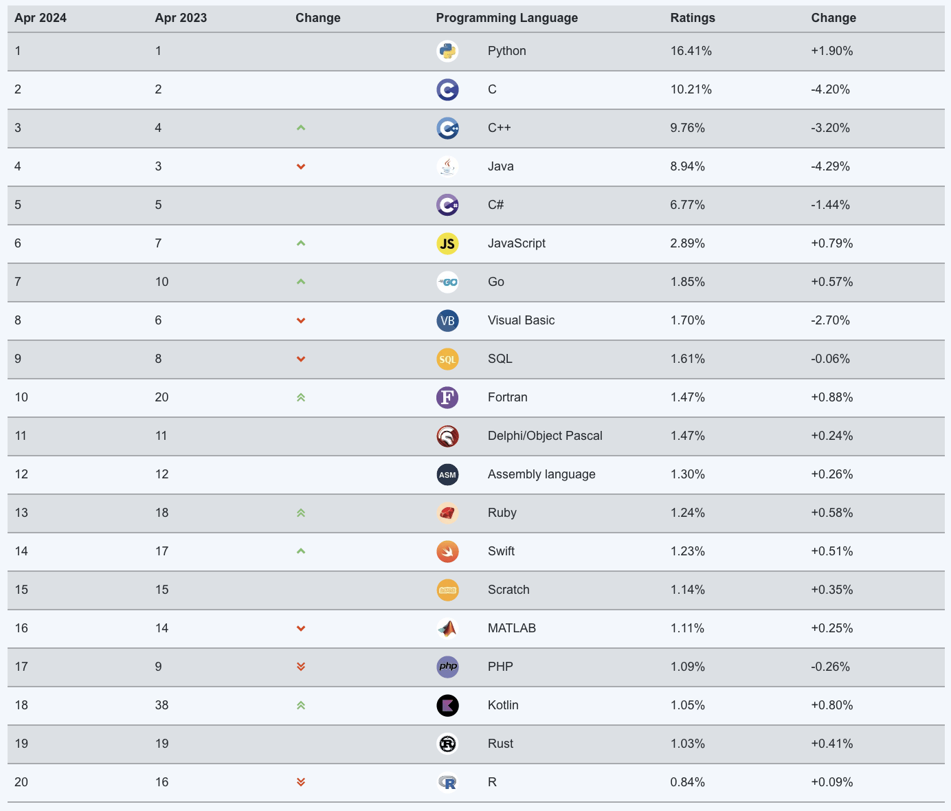 IT之家 4 月 9 日消息,TIOBE 编程社区指数是一个衡量编程语言受欢迎程度的指标,评判的依据来自世界范围内的工程师、课程、供应商及搜索引擎,日前 TIOBE 官网公布了 2024 年 4 月的编程语言排行榜,IT之家整理如下。 - Python 排名第一,占比 16.41%,本月上升 1.90%