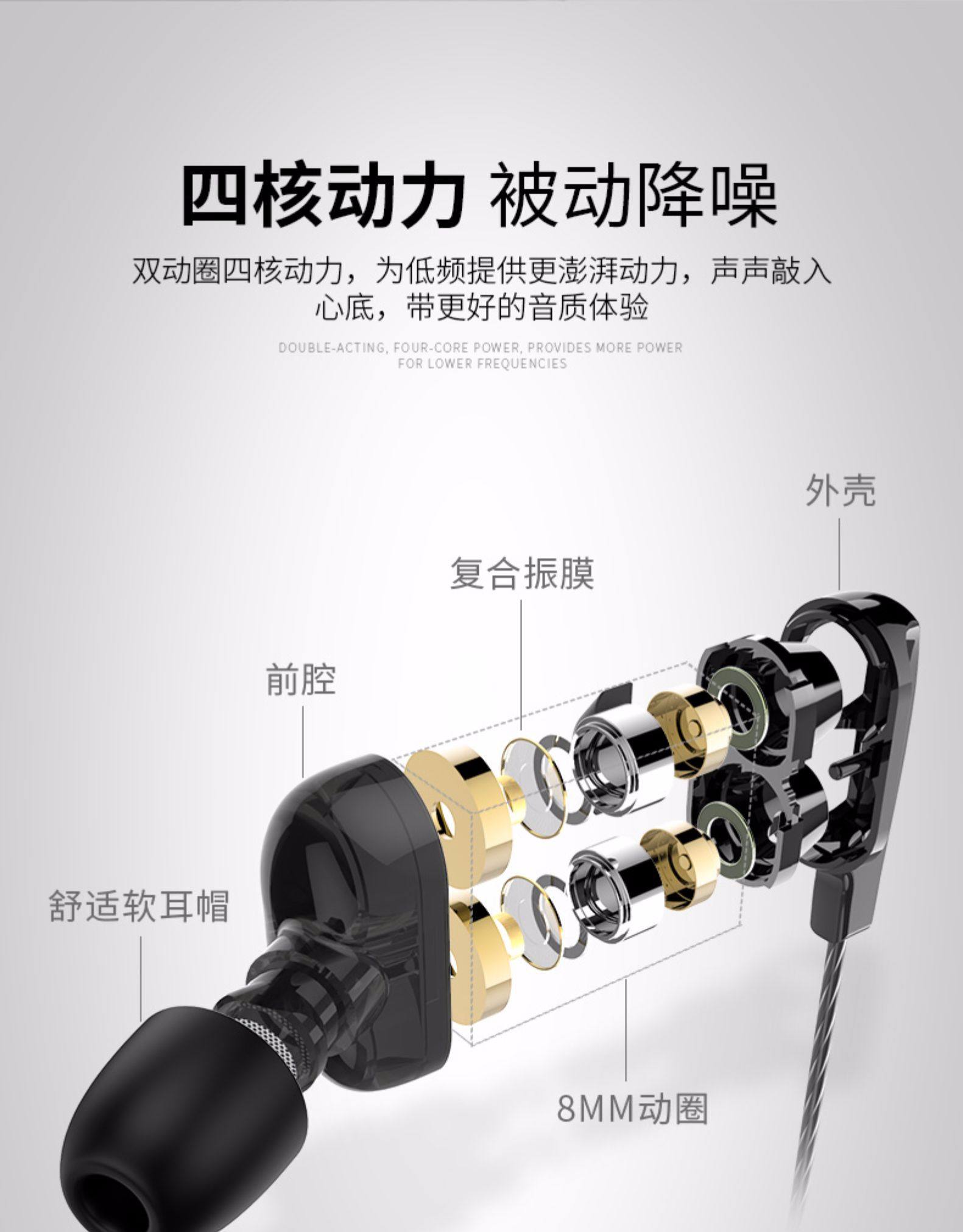特注:原来电商卖倒闭了。代工厂处理的货,经测试个人感觉音质比VIVO的那货还要好,特别是低音更强劲,全新盒装,做工和用料都上乘。建议有需求的值友别错过。四核双动圈耳机(如R/L声道里分别有两个喇叭,共4只喇叭)。 白菜价耳机。 喜思黎 S8耳机入耳式重低音炮四核双动圈hifi带麦K歌有线高音质手机电脑通用苹果耳塞线控华为小米男女生挂耳