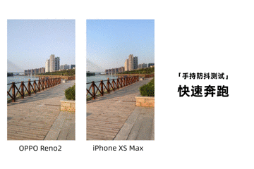 运动类的视频跟拍是个大问题,你如果跟着被拍摄者一起运动,抖动是不可避免的。再用OPPO Reno跑动的情况下拍摄,发现iPhone XS Max差别是很大的,虽然iPhone的视频画面稳定性也不差,但是难免会因为抖动而造成的画面有左右摇晃的情况出现,所以在观感上是不如OPPO Reno2的,相比之下OPPO Reno2即便在奔跑的情况下画面也没有出现晃动。
