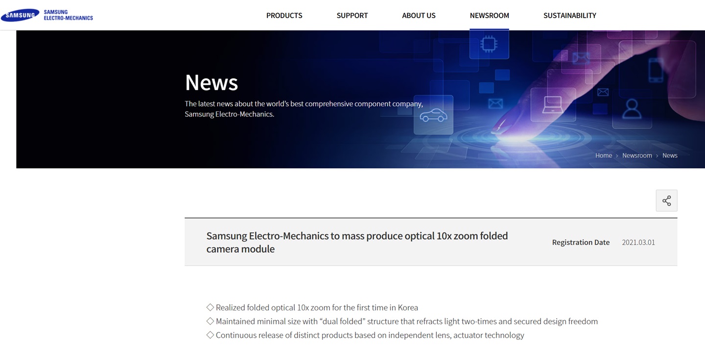 三星在其最新旗舰手机 Galaxy S21 Ultra 上搭载了 10 倍光学变焦的潜望式摄像头模块,该模块是三星首款在智能手机相机中搭载的双折叠(dual folded)光学 10 倍变焦的产品。 三星电机昨日宣布,它已经在向全球智能手机公司供应该模块。