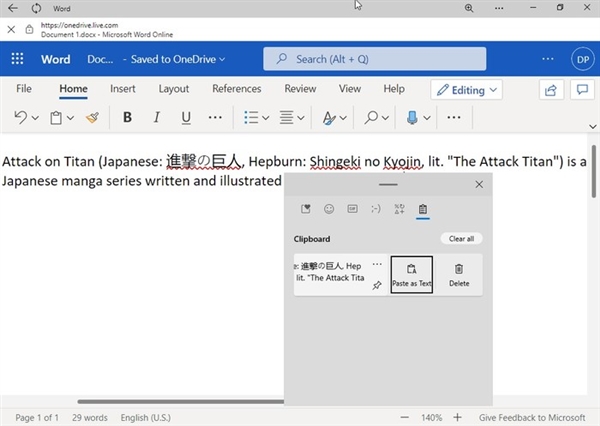 新的剪贴板管理器,有输入表情等功能 新的剪贴板管理器可以让用户在各种应用程序,如Outlook、Gmail、Facebook以及Twitter等上面,都能更轻松地添加媒体内容。 它的用法和之前相似,按下“Win+V”就可以呼出剪贴板管理器,从中点击表情符号或者GIF,就可以添加到文本区域了。除此以外,它还带有搜索功能,可以通过搜索滑动列表找到更多内容。 全新的复制粘贴体验 多年以来,将文本粘贴到电子邮件、文档以及其他App中,一直存在一个问题——如果你想要去掉粘贴文本的格式,例如字体、段落等等,那么往往需要很大的耐心,通常的做法是先粘贴到记事本,然后再从记事本复制过去。 而在Win10全新的剪贴板管理器中,不仅在云剪贴方面有了更多功能,而且还新增了“粘贴为纯文本”的选项。