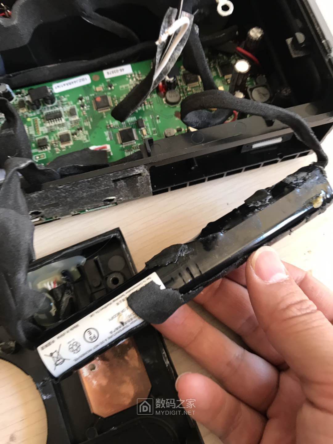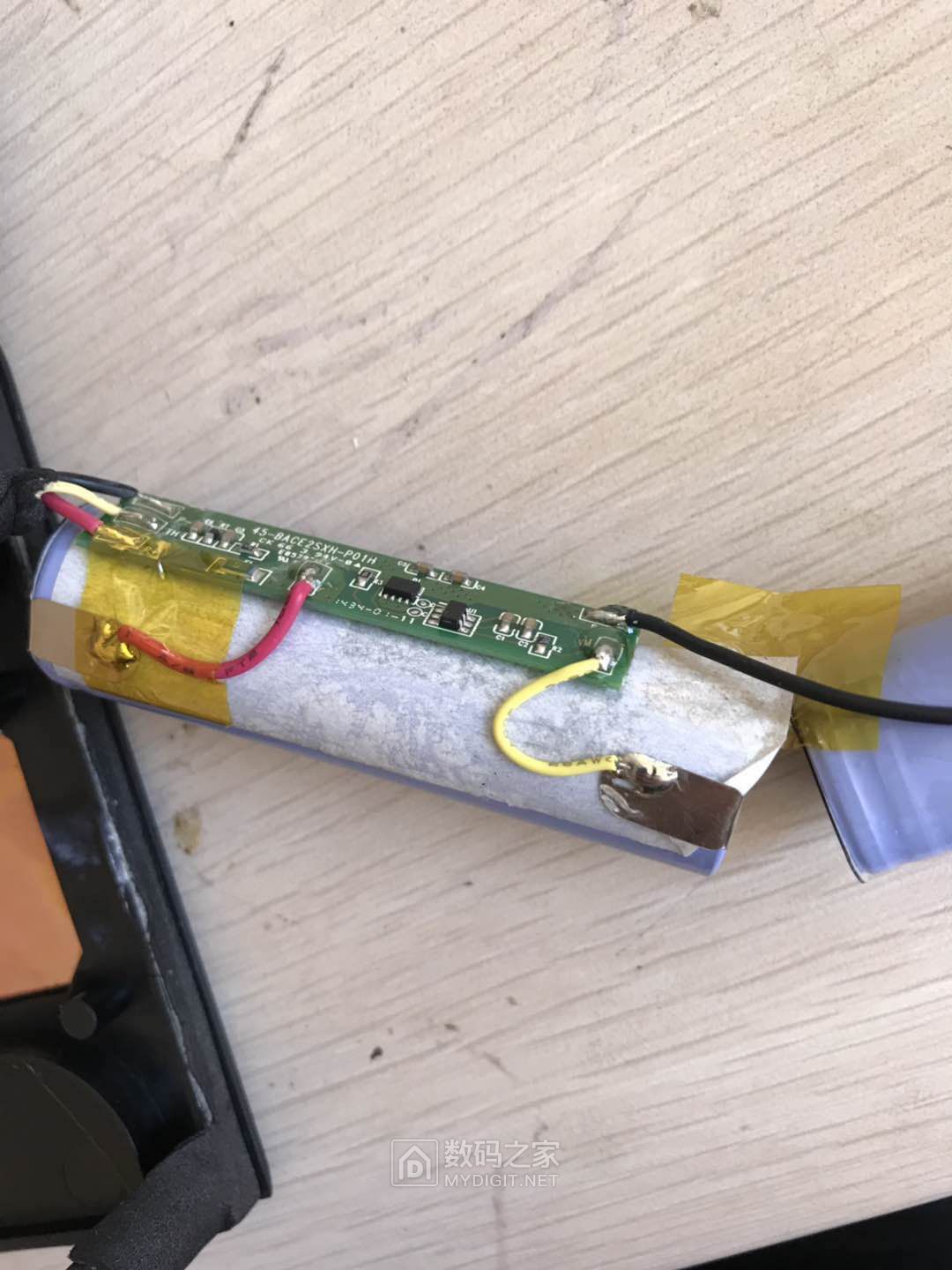 这时,可以看到电池了,是2节18650的锂电串联,撕掉黑胶布,用万用表测试,其中一节电池电压4.8V,另一节基本没电压,和我的判断一致,可以肯定是电池的问题。用烙铁取下电池两极和中间的焊点,电池就可以拆下来了。