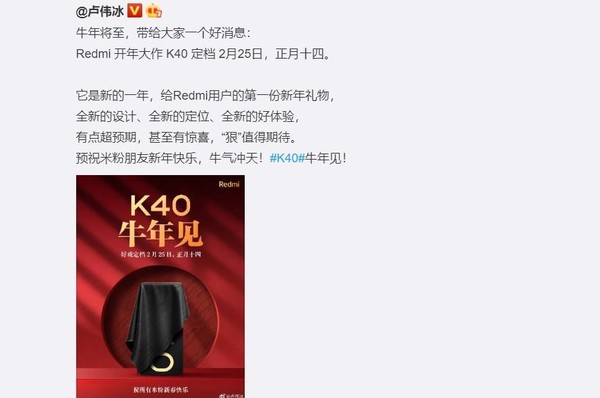 2月9日上午,红米Redmi品牌总经理卢伟冰正式宣布,Redmi开年大作K40定档2月25日,正月十四,它是新的一年,给Redmi用户的第一份新年礼物。由此来看,最近有换机需求的小伙伴不妨再等等,年后Redmi K40会成为你不错的选择。