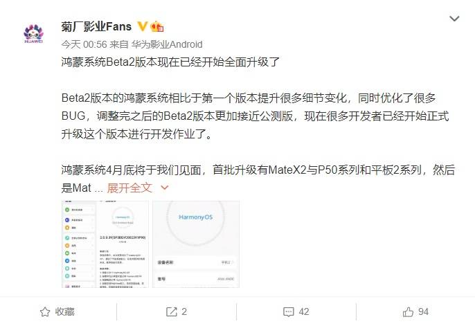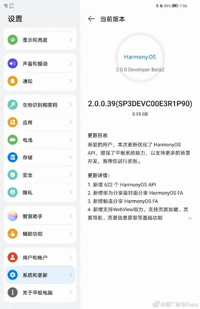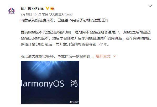 根据该博主爆料的截图和更新说明看,此次近1G的鸿蒙系统开发者Beta 2版本主要更新的内容如下: 新增 622 个 HarmonyOS API 新增华为分享面对面分享 HarmonyOS FA 隐私 新增畅连分享 HarmonyOS FA 新增支持 WebView 能力 , 支持页面加载、页面导航、页面信息获取等基础功能 随后该博主再次爆料,“鸿蒙系统按进度来看,已经基本完成了初期的适配工作 目前beta版本仍然还在很多Bug,短期内不会推送给普通用户,Beta2之后可能还会推出Beta3版本,然后才会陆续开启小规模普通用户的内测版,这个内测时间初步估计是5月份前后,而开放升级则可能会等到下半年。