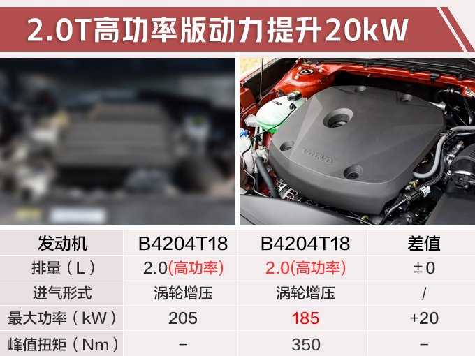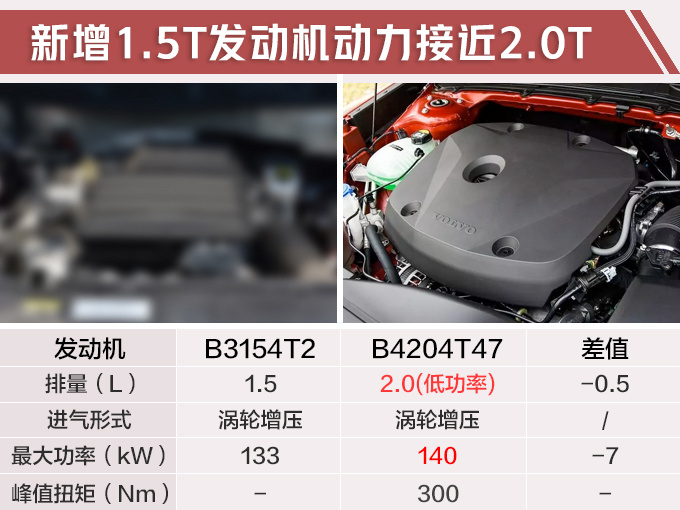 国产XC40增搭代号为B3154T2的1.5T发动机,最大功率133kW,与目前在售的进口版XC40搭载的2.0T低功率版动力接近。国产XC40依然提供2.0T高低功率两款发动机,最大功率分别为205kW、155kW,相比进口版车型使用的2.0T发动机,分别提高20kW、15kW。传动系统方面,与2.0T匹配的预计仍为8速自动变速箱,并提供四驱系统。