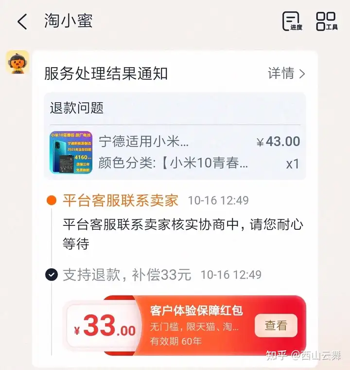 我把结果反馈给淘宝,判了退款退货,并给了一个33元红包。