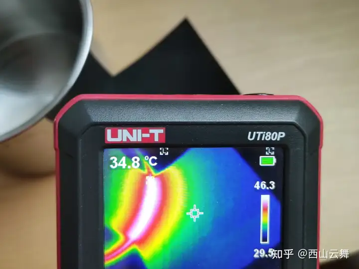 拿一个不锈钢器皿装了点热水,压在其中一个角上,用热成像仪观察。热量迅速扩散,10来20秒后就稳定了,实测热源点46.3℃,大约三厘米外温度,34.8℃环境温度29.5℃,按照表面换热系数10W/㎡·K,估算其水平方向导热系数约1600W/m·K,与商家声称的2300差不多。