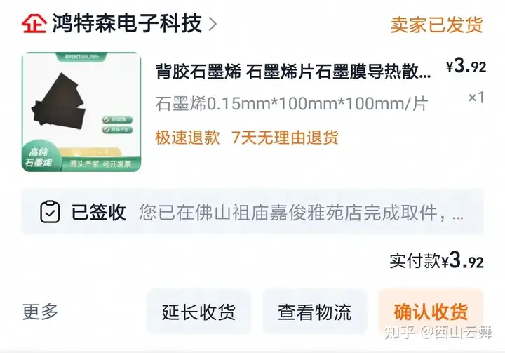 到手开箱就平平无奇一张10×10厘米黑不溜秋的薄薄的石墨烯散热片。