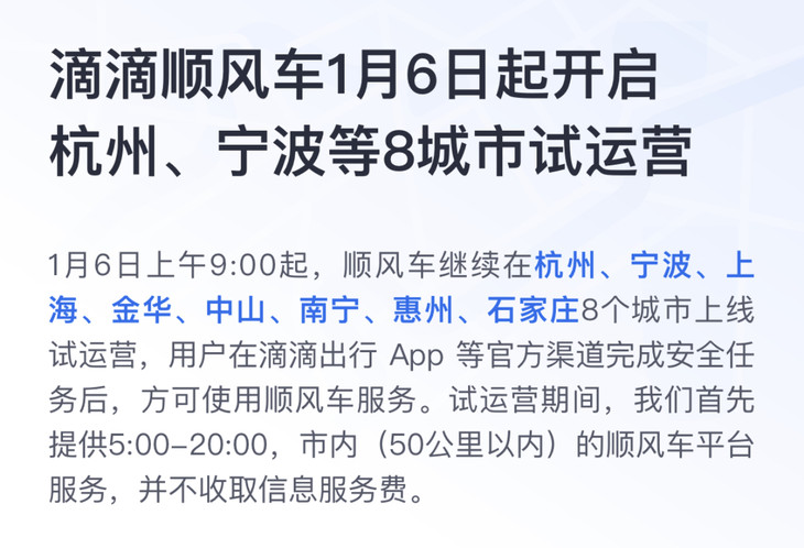 滴滴顺风车在试运营期间,仅在5时-22时提供市内50公里内的服务,并且免除信息服务费。重启后的滴滴顺风车,你还会继续使用吗? 特别提醒:本文来源互联网,目的在于传递更多信息,如有冒犯联系清删