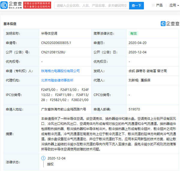 近日,格力电器新增一条“半导体空调”专利信息。 企查查信息显示,该专利早在今年4月20日就已申请,公布日为2020月12月4日。发明人共有四人:余凯、薛寒冬、谢有富、曾才周。