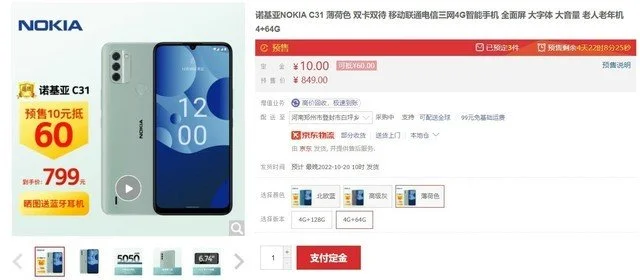 该机另一大亮点是电池,其内置了5050mAh电池,加上分辨率较低的屏幕以及规格较低的处理器,续航表现应该会非常不错。不过最高只支持10W充电,充电时间可能会比较长。颜色方面,诺基亚C31提供了高级灰、北欧蓝、薄荷色三种配色。 价格方面,4GB+64GB版本售价799元,4+128GB版本售价869元。