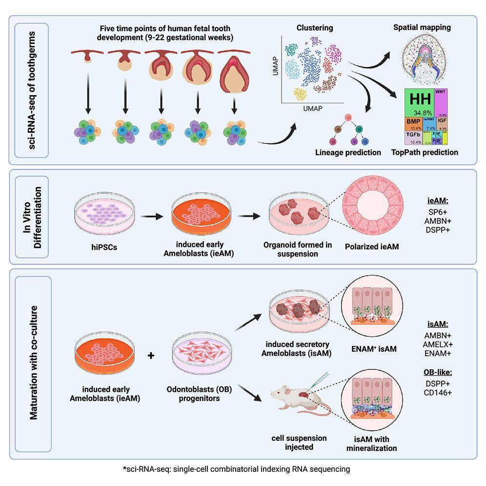 IT之家 8 月 17 日消息,来自西雅图华盛顿大学的多学科研究团队近日研发出牙釉质干细胞,在实验室环境下成功分泌牙釉质生成蛋白,最终形成微型牙齿。 牙釉质是保护牙齿免受损伤和腐烂的物质,帮助牙齿承受咀嚼的压力,但日常饮食会磨损牙釉质,导致牙齿出现裂缝和龋齿。 牙釉质在牙齿形成过程中,由称为釉细胞的特殊细胞形成,在牙齿完全成形之后,这些细胞就会死亡。目前人体无法修复或者再生受损的牙釉质。 相关研究结果发表在《Developmental Cell》期刊上,IT之家在此附上链接,感兴趣的用户可以前往深入阅读。 该研究论文的主要作者,来自华盛顿大学医学院生物化学系的 Ammar Alghadeer 表示:“我们已经朝着长期目标迈出了第一步,我们的目标是开发出干细胞疗法,修复受损的牙齿,并让其再生”。 研究团队使用名为单细胞组合索引 RNA 测序(sci-RNA-seq)的技术,揭示了在细胞发育的不同阶段,哪些基因处于活跃状态。 团队运用该技术观察人类牙齿细胞发育过程,并借助专门的 Monocle 算法,构建出了未分化的干细胞发育,分化成为釉细胞的完整基因活动轨迹。 在掌控这个活动轨迹之后,研究人员经过多次试验和错误,能够诱导未分化的人类干细胞成为成釉细胞。