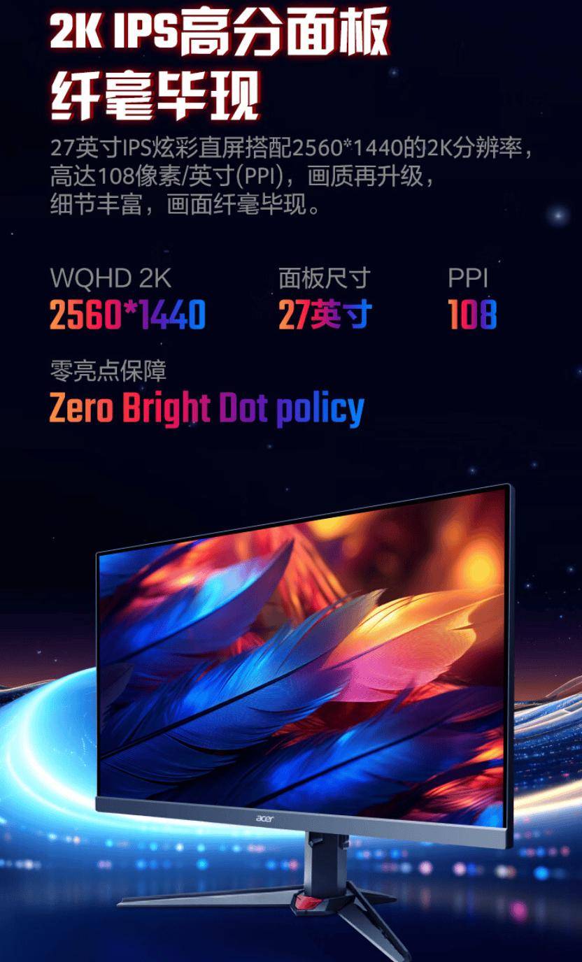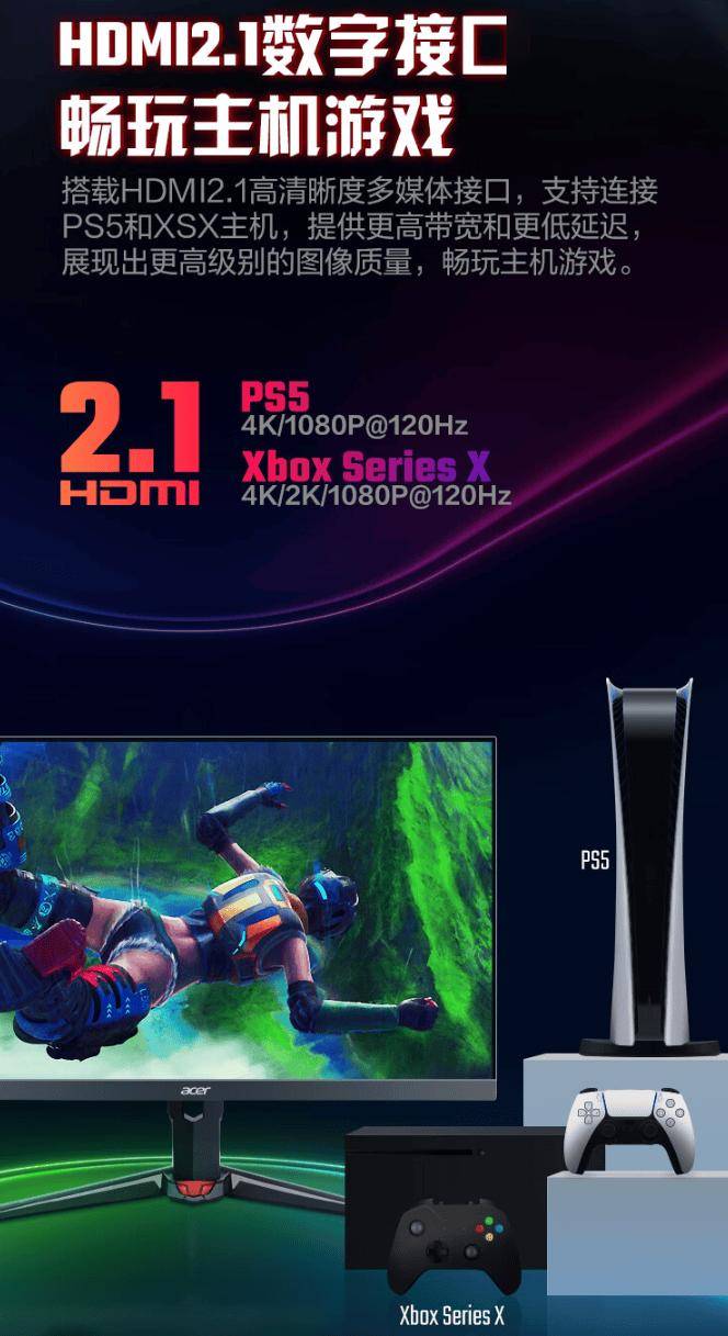 宏碁暗影骑士显示器 XV272U F3 开启限时优惠,原价 2099 元,8 月 10 日前购买优惠 100 元,售价1999 元。 据介绍,宏碁暗影骑士显示器 XV272U F3 配备 HDMI 2.1 接口,支持连接 PS5(4K / 1080P@120Hz)和 Xbox(4K / 2K / 1080P@120Hz)主机,搭载 Fast IPS 2K 面板,尺寸为 27 英寸,分辨率 2560×1440,PPI 108,覆盖 99% sRGB 色域,色数 10.7 亿,色深 8bit+FRC。 XV272U F3 通过 HDR400 认证,原生支持 300Hz 刷新率,GTG 响应时间 1ms,同时支持 AMD FreeSync Premium 显示变频技术,可避免画面撕裂。 该显示器内置 2W×2 音箱,配备旋转升降底座,支持升降高度、水平旋转、垂直旋转以及俯仰角度调节;配备如下接口: - HDMI 2.1 ×2