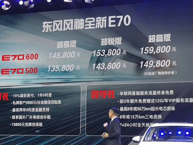 9月5日,东风风神全新E70 600在成都车展正式上市,共推出3款配置车型,售价区间为14.58万-15.98万。新车可看做全新E70的高续航版本,综合续航里程为508km,比E70 500车型提升了107km。新车可享受8年或15公里的三电质保,最高8年或50万公里的超长电芯质保,前三年还额外免费赠送12G/年VIP服务流量。