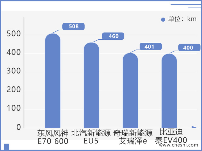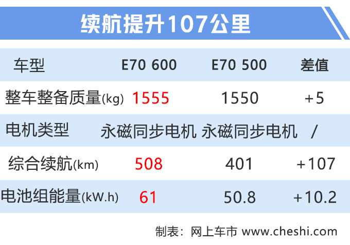 E70 600将搭载的动力蓄电池组总能量为61kWh,电池总质量为365kg,相比现款E70电池能量(50.8kWh)提升10.2kWh。新车508km的综合续航能力,远超同级车型——北汽新能源EU5。新车预计延续现款E70的驱动电机,最大功率为110kW,峰值扭矩为260N.m。