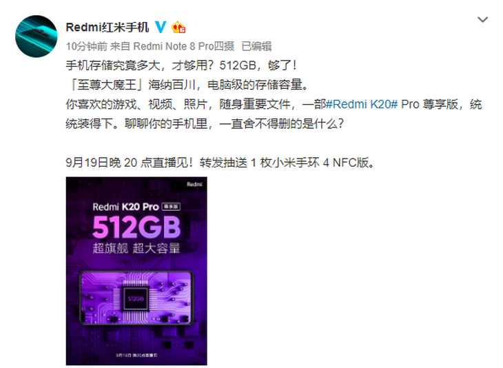 今天上午,Redmi红米手机官方微博公布了Redmi K20 Pro尊享版一大亮点,该机拥有电脑级的512GB超大存储容量,不管是大游戏、视频、照片或是随身重要文件统统都能装得下。