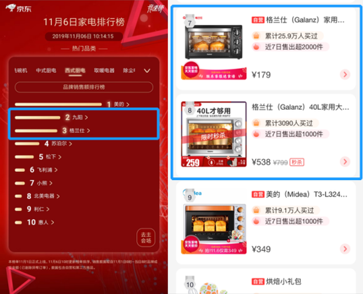 西式厨电中,格兰仕表现非常出色。自11月1日开榜以来,格兰仕一直仅次于美的,第三名九阳一直紧追并被超越。但从名单上看,他们之间的差距非常小,格兰仕完全有可能重新获得第二名。格兰仕家用电器多功能电烤箱,以其精美的外观、简单方便的操作、5种烧烤方式、60分钟计时功能,取得了很高的销量,占据了热卖榜的第七位,非常值得入手。
