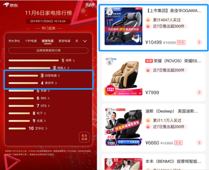 现在越来越多的人关注健康和美丽。在健康电器中,迪斯很快从1日的第三位超过了奥贾华和荣泰,跃居第一位;排名第三的尚铭电器和第四名的奥佳华一直在暗中追逐。看榜单显示,尚铭电器和奥佳华的销量几乎齐平,可以看出两者的较量一直都没有间断。热卖榜第四名这款奥佳华OGAWA按摩椅想必为奥佳华的排名出力不少。相比其他同类产品,它的零重力太空舱可以让我们保持更放松的按摩状态,从颈至腰推拿按揉、背部定点牵引拉伸帮助我们解除上班一天的疲乏。除此之外,它的包腿式足腿护理能刺激脚部穴位,将舒爽直至全身。当然价格也是比较实惠的,所以是一个不错的选择!