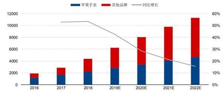 2019年全球智能手表出货量能有多少?同为调研机构的Trendforce给出的预测数字是6263万部,相比2018年的4400万部有了大幅增长。同时机构还表示2022年全球智能手表出货量将首度破亿,达到1.13亿块。IDC预测数据更为乐观,2022年或有望达到1.904亿部。可见在手机销量增长乏力的情况下,智能手表将成为终端厂商新的突破点。