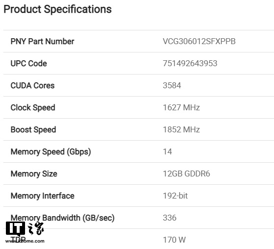 另外,这款显卡配备12GB的GDDR6显存,拥有8针辅助供电,整体功耗为170W。同时它还拥有三个DisplayPort接口和一个HDMI接口。目前还不知道这款显卡的价格和上市时间,IT之家会保持关注。