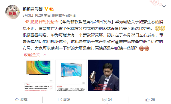 据数码博主@鹏鹏君驾到 爆料称,华为可能会推出新款智慧屏,初步定于本月25日左右发布,带来强悍的功能和视听体验,这也是有助于完善新款智慧屏产品在高中低全价位的布局。 2019年9月,华为智慧屏横空出世。作为客厅新物种,华为智慧屏颠覆了人们对传统电视的认知,定位为家庭的四大中心:智慧交互中心、跨屏体验中心、IoT控制中心和影音娱乐中心。 2年内,华为智慧屏推出了中端V系列、高端X系列、入门S系列三大系列智慧屏。目前尚不清楚即将发布的智慧屏新品属于哪一系列。