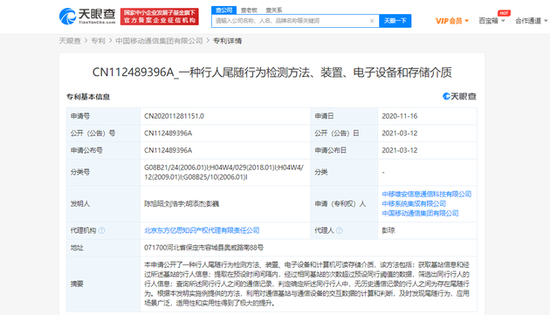 新浪科技讯 3月12日下午消息,天眼查App显示,3月12日,中国移动通信集团有限公司公开一项名为“一种行人尾随行为检测方法、装置、电子设备和存储介质”的专利。专利公开号为CN112489396A,申请日期为2020年11月16日。