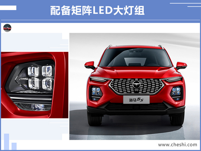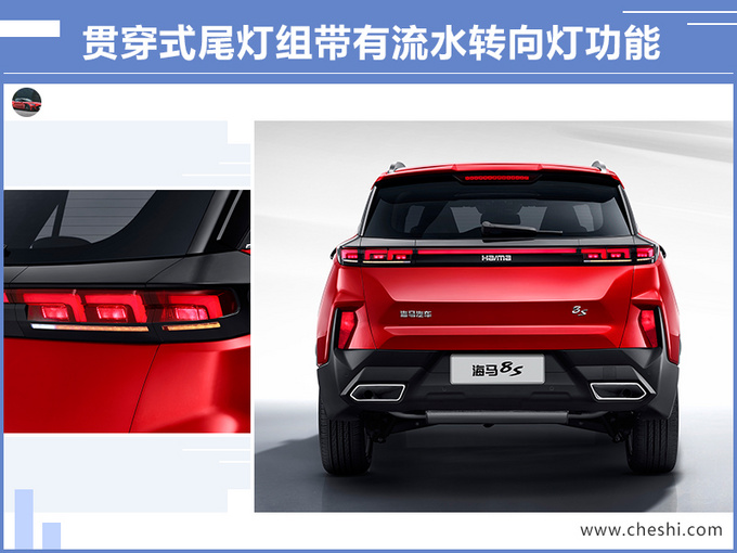 海马8S前脸六边形点阵进气格栅与LED日行灯相连,下方为矩阵式LED大灯和雾灯组。新车侧面采用了时下流行的悬浮式车顶设计,锋利的腰线和19英寸轮毂让该车充满了力量感。车尾配有贯穿式LED灯组,排气为双边双出式布局。内饰方面,海马8S整体设计比较年轻、时尚,六边形出风口与进气格栅相呼应,下方保留了部分实体按键。新车配有全液晶仪表、10英寸中控屏、前排无线充电等。