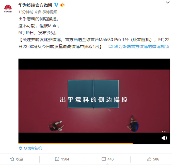 除了摄影摄像方面,操控方面华为Mate30系列也将带来全新体验, 在最新预告视频中可以看到,华为公布了一个让人意想不到的功能:侧边操控。视频中,一对男单在火热的比赛中,激烈的赛况也让“赛场”从球桌的平面转移到球桌一侧,两位选手就利用这一条球桌侧边的方寸之地,你来我往地打着比赛。这则广告片幽默地说明了华为Mate30系列将充分利用手机侧边,全面提升操控体验。