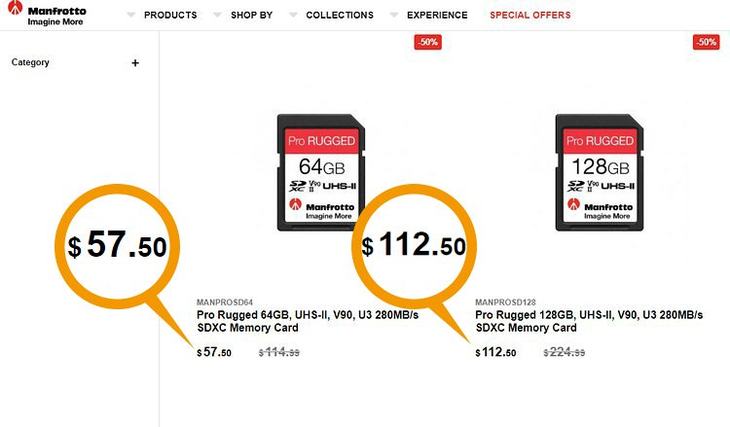 Manfrotto Pro RUGGED储存卡现已在品牌的美国官方网店发售,SD卡零售价为:115美元(64GB),225美元(128GB);microSD卡零售价为:32美元(64GB),42美元(128GB);CF卡零售价为80美元(64GB),150美元(128GB)。 特别提醒:本文来源互联网,目的在于传递更多信息,如有冒犯联系清删