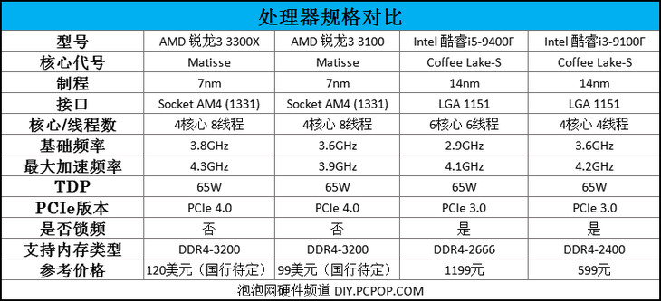 从上面的处理器规格对比列表来看,锐龙3 3300X以及锐龙3 3100有很多一致的地方,例如它们均采用了4核8线程设计,7nm工艺制程,Zen 2核心架构,均支持DDR4-3200MHz内存,均拥有18MB高速游戏缓存。