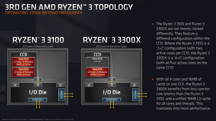 除了默认频率之外,这两款新一代锐龙3系列台式机处理器在CCD设计方面也有一个比较明显的区别。根据AMD官方的PPT可知,锐龙3 3300X的一颗CCD内集成有一颗四核、7nm的CCX,这颗CCX配备16MB三级缓存。而锐龙3 3100的一颗CCD内集成了两颗双核、7nm的CCX,每颗CCX配备8MB三级缓存。 凭借着单CCX设计的优势,锐龙3 3300X在很多应用场景当中都会带来更好的性能表现。