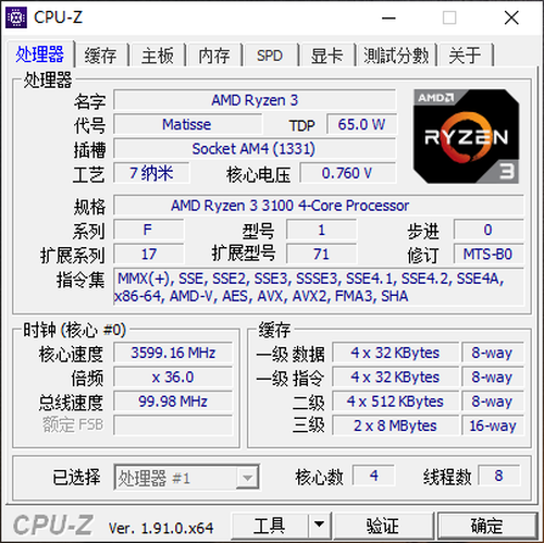 (锐龙3 3100处理器的CPU-Z信息) 在频率设置方面,锐龙3 3300X跟锐龙3 3100就存在区别了。由于锐龙3 3300X定位更高,因此它拥有更高的基础频率和最大加速频率,默认性能自然要更高一些。