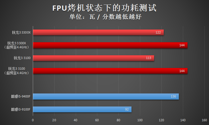 默频状态下,这两款新一代锐龙3系列台式机处理器的功耗表现均非常的不错。 在全核心超频至4.4GHz之后,锐龙3 3300X的功耗高出了20多瓦,锐龙3 3100的功耗高出了30多瓦。付出如此的功耗而带来明显的性能提升,称得上物有所值。