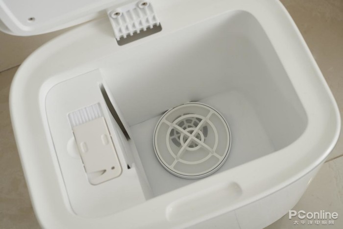 掀开顶部的盖子则可以看到集尘系统的内部情况,可以看到出气口带有滤网装置,防止将灰尘吹出,同时还贴心的附赠了一把小清洁刷。