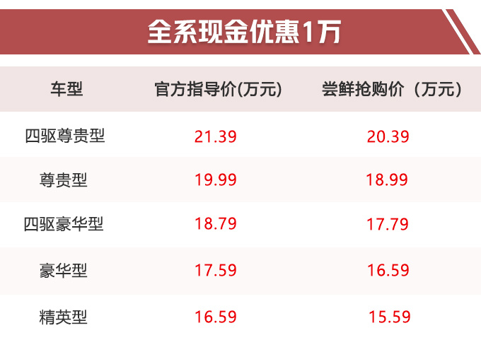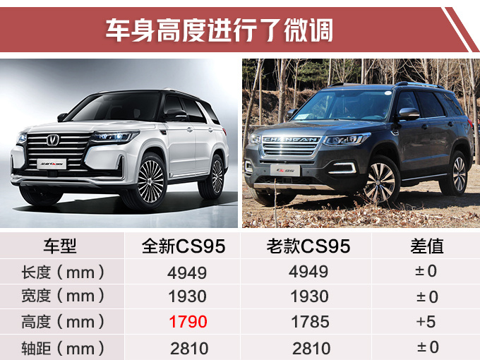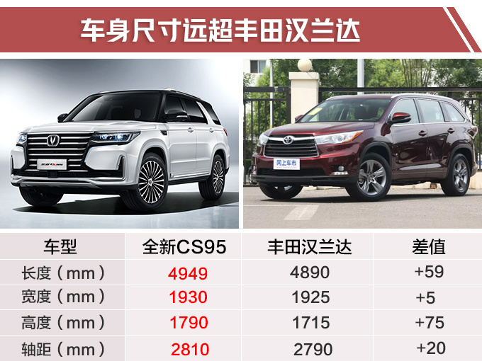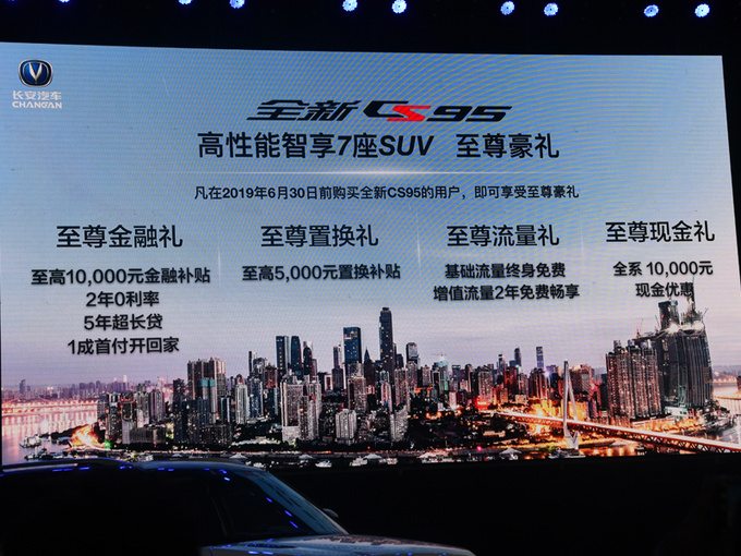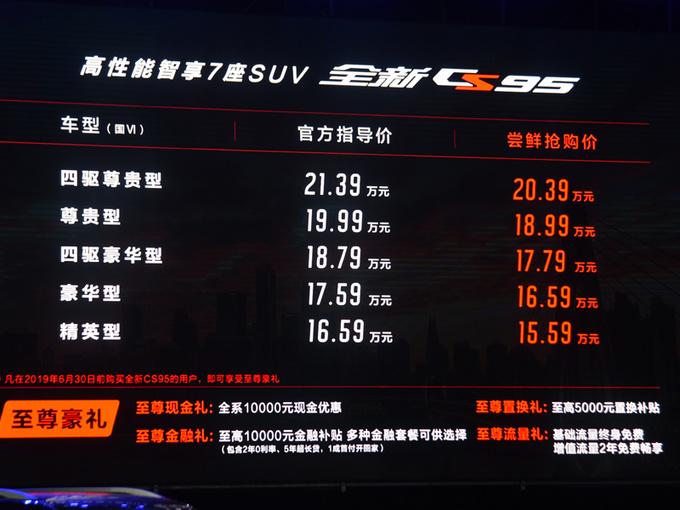 4月2日,长安旗舰SUV车型——全新CS95正式上市,共推出5款配置车型,售价区间为16.59万-21.39万,6月30日之前购买可享受1万元现金优惠,最终售价区间为15.59万-20.39万。新车针对外观、内饰以及配置进行了大幅升级,车身尺寸也进行了微调,全面超越丰田汉兰达。 6月30日购买全新CS95还可享受至尊金融礼,首付仅1成。以入门版精英型为例(北京地区),首付(1.5万)+购置税(约1.2万)+交强险(950元)+车船税(480元)+上牌费用(500元)总计约3万元就能把全新CS95开回家。 10秒读懂长安全新CS95: 1、前脸大面积镀铬装饰,相当霸气; 2、尺寸比汉兰达大了一圈,全系7座版; 3、2.0T发动机配德系四驱系统,越野通过性能强; 4、车载互联系统功能丰富,可自动泊车、刹车;