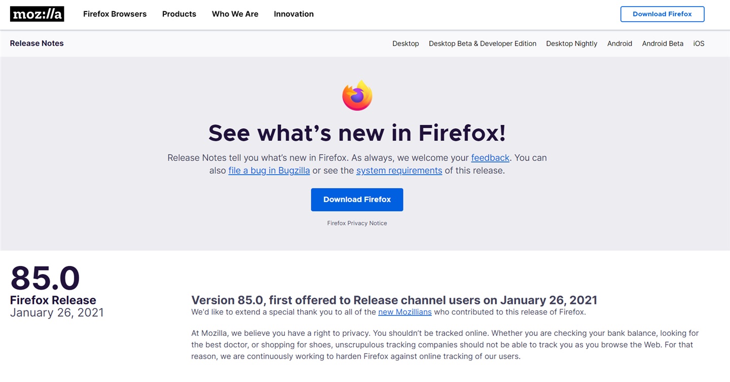 昨日,Mozilla 正式发布火狐浏览器 Firefox 85 版本。此次大版本更新带来了超级 Cookie 保护功能、更易用的书签管理,以及一键删除密码功能。另外,此次更新也正式停止了对 Adobe Flash 的支持。