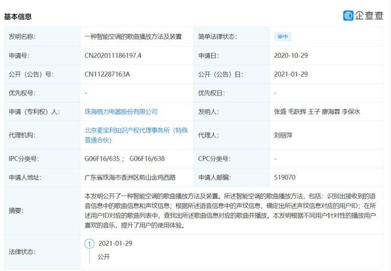 本文来自太平洋电脑网 在大家眼里,空调的主要用途就是制热或是制冷,当然一些新风空调还有净化空气的用途,总的来说,大部分人都不会将空调与娱乐联系到一起。不过近日,格力就公开了一个音乐空调的专利。 据媒体报道,企查查App显示,1 月29日格力电器公开名为 “一种智能空调的歌曲播放方法及装置”相关专利,公开号CN112287163A,申请日期为2020年10月29日。根据专利的摘要描述,所述智能空调的歌曲播放方法包括识别出接收到的语音信息中的歌曲信息和声纹信息;在所述用户ID对应的歌曲列表中,查找出所述歌曲信息对应的歌曲并播放。