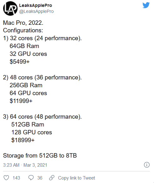 消息还表明,新款Mac Pro将采用苹果自己定制的CPU和GPU。这应该不会让人感到意外,因为苹果一直在研发自己的定制CPU和GPU,已经有一段时间了,所以考虑到苹果一直以来M1芯片的成功,最终能看到有新的选择终于上市是一件好事。 苹果下一款Mac Pro可能内置一颗高达64核心的自研处理器产品,价格最高可达18999美元。 该消息来自Twitter博主LeaksApplePro,他还分享即将到来的Mac Pro 2022具体配置: 1)32核心(24性能核心)。 64GB内存 32个GPU核心 $5499+ 2)48核心(36性能核心)。 256GB内存 64个GPU核心 $11999+ 3)64核心(48性能核心)。 512GB内存 128个GPU核心 $18999+ 存储容量从512GB到8TB - LeaksApplePro(@LeaksApplePro)2021年3月2日。