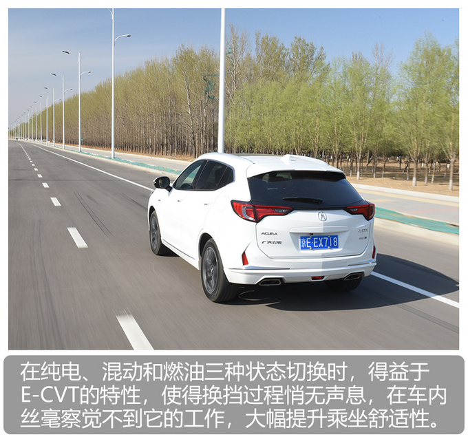 讴歌CDX Hybrid的E-CVT变速箱并不像传统的变速箱一样来进行换挡,这个E-CVT的实质其实可以理解成两个电动电机加上控制双电机的动力控制单元,而在纯电、混动和燃油三种状态切换时,也得益于E-CVT的特性,使得整个换挡过程悄无声息干净利落,在车内丝毫察觉不到它的工作,大幅提升乘坐舒适性。