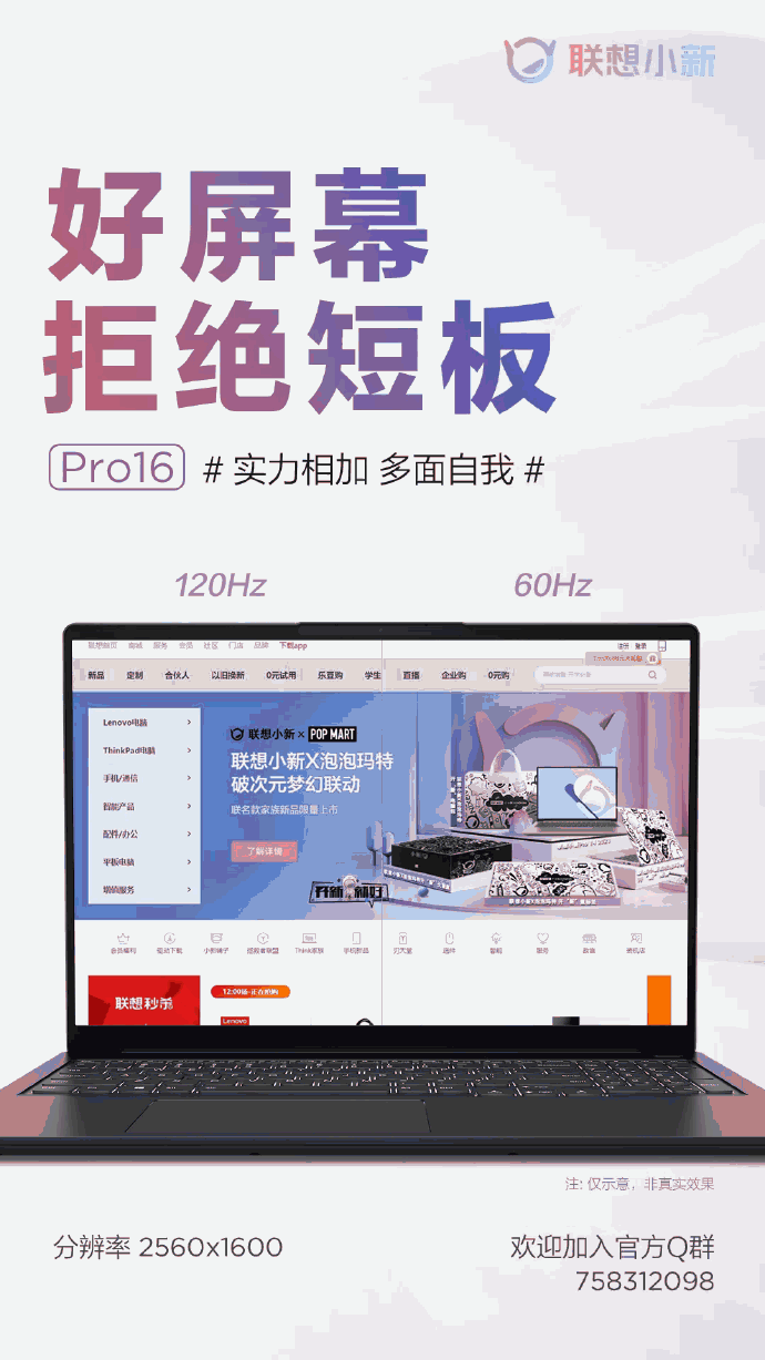 联想表示,小新 Pro 16 将搭载 16 英寸的 2560x1600 分辨率屏,可选 120Hz 高刷新率,350nits 高亮度,100% sRGB 高色域,莱茵硬件低蓝光 + Eyesafe 认证,DC 调光无频闪。 IT之家了解到,今年众多高端游戏本用上了 2K 165Hz 的屏幕,但像小新 Pro 16 这样的 16 英寸 2K 120Hz 屏还是头一个。按照小新 Pro 14 的设定,小新 Pro 16 应该可以通过快捷键进行 120Hz 和 60Hz 的切换。 日前,联想宣布小新 Pro 16 配置为 AMD 锐龙 5000 处理器和英伟达独显,预计最高为 R7 5800H+RTX 3050 Ti 的配置。