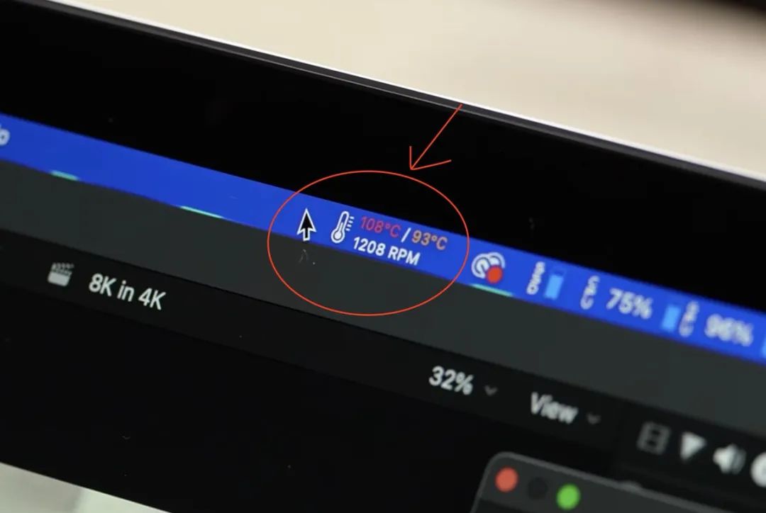 可一码归一码,一顿操作猛如虎,最后不还是得视频导出的嘛。 万万没想到,就是在导出佳能的8K RAW视频这里,M2彻底暴露了“原型”。 虽然我们都知道,导出素材对性能要求很高,特别这还是8K RAW视频,对M2这入门款处理器来说,已经超过了它的能力范畴。 所以M2的CPU和GPU双拉满,也是在预料之中,但... M2的温度,竟然飙到了108℃。