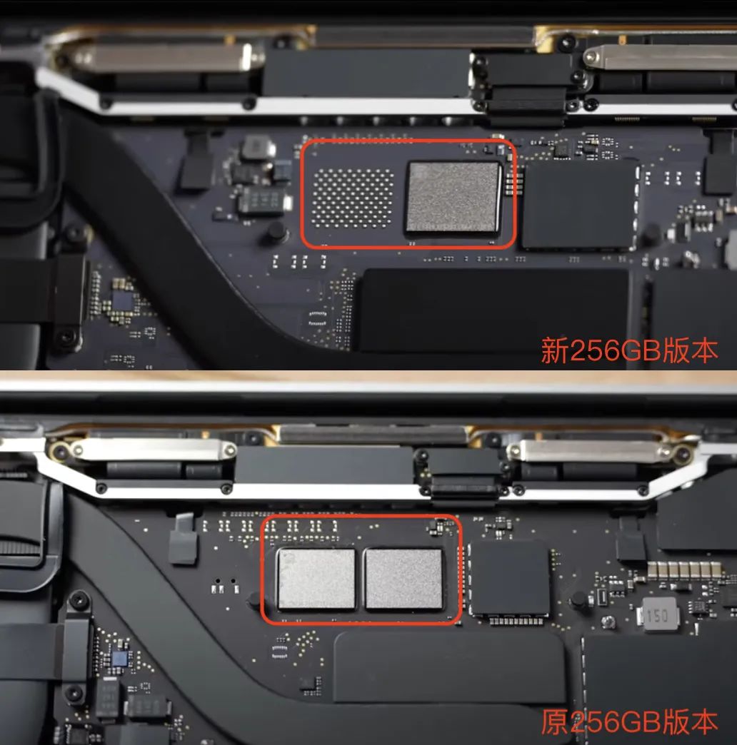 但作为SSD最早的应用厂商,一直以读写速度远高于同行为口号的苹果。 竟然一声不吭的,偷偷把闪存颗粒给砍掉了一块,属实让人无法理解。 但在512GB,以及更高硬盘规格的机型上,依旧是采用两枚闪存颗粒。 偏偏就是在这入门款256GB的Mac上,苹果玩了这么一手骚操作。 so,机哥建议大家埋伏一手,等新Air上市后再做决策。