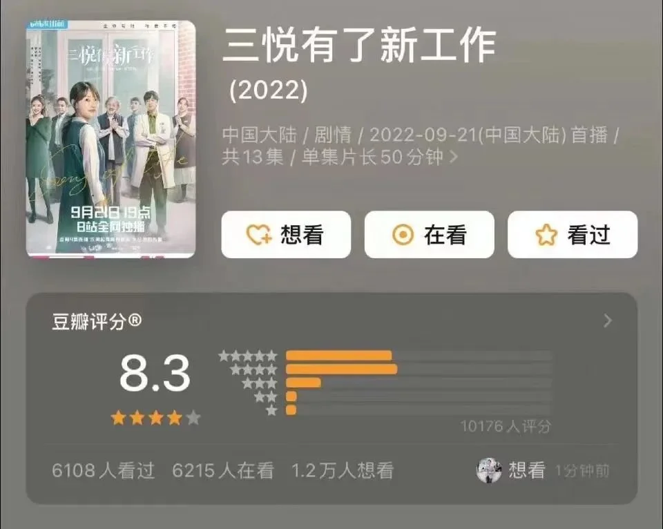 撰文/黎炫岐 编辑/ 文 婕 剧集播到超三分之二,B站推出的自制剧《三悦有了新工作》(以下简称《三悦》)终于有了些声势。 9月21日开播,10月9日豆瓣开分8.3,B站站内开分9.6,不可否认目前其口碑不错。作为B站今年的第三部长视频自制剧,无论是从其幕后班底还是演员团队来看,都暗藏了B站不小的期待与野心。 另一边,B站也在自制综艺上持续发力,继《90婚介所》后于今年上线了《90婚介所2022》,并且对节目做出了较大的改版。 然而,距离B站通过《说唱新世代》和《风犬少年的天空》(以下简称《风犬》)试水自制内容已过去两年,其不温不火的处境却没有什么改变,口碑不错,但市场反应平平。以《三悦》为例,据“骨朵网络影视”,目前其集均播放量1000万左右,只刚刚够到以往B站长视频自制剧播放量的平均水平,未能有效拉动增长。在骨朵剧集排行榜上,本剧也一直在日榜20名左右徘徊,存在感不高。 总体来看,像极了网友们挂在嘴边的那句,“有点东西,但不多”。 爆款幕后、话题度演员、小众题材,却难造爆款? “本来没有抱太大期待,随手点开看了看,结果整个周末都在看这个剧。”22岁的谢寒不算是B站的资深用户,之前也没看过B站的自制内容,而这一次却被这部“低调”的剧戳中了。大抵是因为谢寒和剧中的女主三悦一样,刚大学毕业,“她在剧中的经历我都经历过,一开始就是找不到工作的焦虑和想躺平的无奈,代入感太强了。” “女孩这一路啊,完美,往往就是最大的陷阱。”、“妈妈要你懂事,要你勇敢,要你出人头地,要你拼命往上爬,就是没有教你怎么做个小孩。”……这些句台词让谢寒彻底“破防”,决定认真追完这部剧,并迅速安利给了所有姐妹。 事实上,正有不少“谢寒”发现这部剧。在小红书上,这部剧的口碑也还不错,不少影视博主发布影评称之为“下半年最好的剧”、“巨好看的国产神剧”、“被名字耽误的好剧”等等。 也有不少网友开始成为“自来水”,并磕起了CP。就连女主的穿搭也成为了小红书上的热门笔记。锌刻度留意到,目前关于《三悦》的影评笔记不少已经超千点赞量,其中不乏笔记达到三四千点赞量。而在微博上,其开分当日话题#三悦有了新工作豆瓣开分8.3#火速冲上了微博热搜,而这一话题下也有不少好评,此外还有了#想与三悦分享的一刻#等新话题。