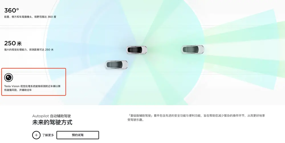 (图源:特斯拉财报) 其次,FSD完全自动驾驶功能交付也在“缓缓推进”。 在财报电话会上,马斯克重申,特斯拉的目标是在今年年底实现测试版FSD系统的广泛推送。“本季度,我们预计FSD系统将在北美市场进行大规模推送。”他还说,大规模推送将在大约一个月后进行,任何一位购买了FSD软件包的用户,会立刻使用到该功能。 虽然,目前不太确定FSD是否会同步向中国区的用户推送,但特斯拉在中国官网的Autopilot自动辅助驾驶介绍页,已经更换了Tesla Vision的描述——视觉处理系统能够探测附近车辆以降低碰撞风险,并辅助泊车。 此前,特斯拉官网就已经公布过:从2022年10月上旬开始,为北美、欧洲等地区的所有Model 3和Model Y不再使用超声波传感器,而是完全依靠Tesla Vision来提供自动驾驶仪、增强型自动驾驶仪、FSD功能和主动安全功能。