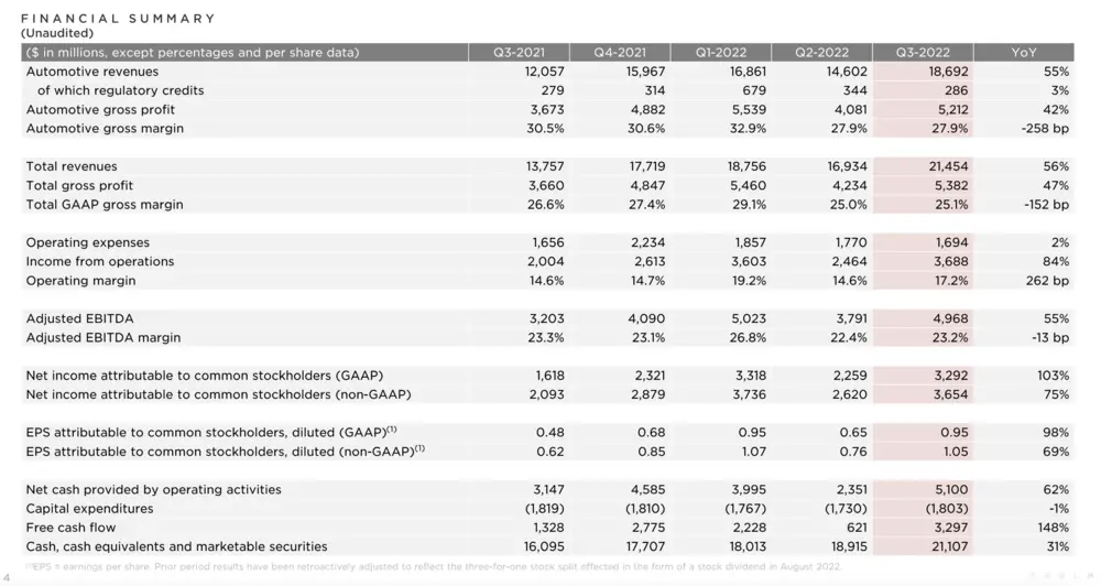 (图源:特斯拉财报) 较高的收入增长,也推动着整体营收水平上扬。特斯拉在第三季度GAAP营业利润为37亿美元,营业利润率为17.2%;第三季度GAAP净利润为33亿美元,非GAAP净利润(未计股份支付费用)为37亿美元;第三季度GAAP汽车毛利率为27.9%。