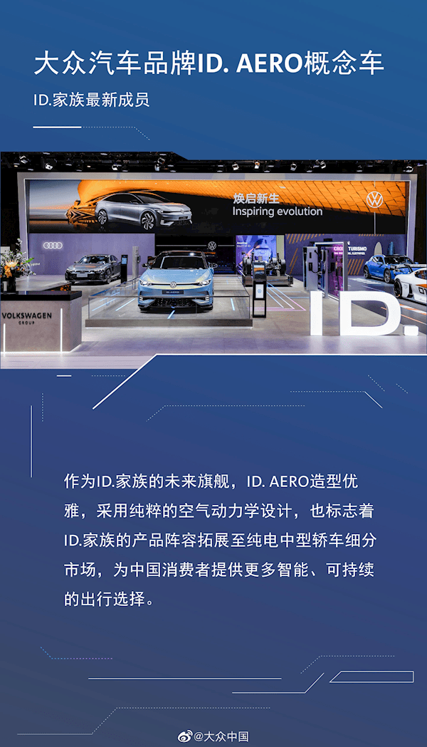 11月7日消息,第五届中国国际进口博览会于11月5日至11月10日如期举办,大众汽车集团(中国)带来了5款纯电车型。 包括大众未来ID家族旗舰ID.AERO、奥迪纯电动运动旗舰RSe-tron GT、本土生产的“Roadjet陆地专机”奥迪Q5e-tron。据介绍,到2022年底,奥迪将在中国市场提供7款新能源车型。 大众表示,新一代豪华概念车ID.AERO将于明年量产上市,定位纯电中型轿车,这也是大众ID.家族首款纯电轿车,基于MEB平台打造。 新车采用大众ID家族设计,包括大众ID标志性的发光车标和弯曲的日行灯带,三点式的雾灯区域进气道光源,还有贯穿式尾灯。 据此前官方透露消息,ID.AERO概念车的尺寸为4975/1897/1528mm,轴距为2966mm,车身尺寸超过大众帕萨特,比此前的VW413定位更高更大。 动力部分,参考此前已经上市的ID.6和ID.4车型,有媒体猜测新车将依旧搭载大众招牌的77kwh电池组,WLTP工况纯电续航里程可达620km。 对于当前大众中国电动车市场来说,目前仅布局有ID.3、ID.4、ID.6三款车型,并未完全涉足纯电轿车,而ID.AERO的到来,将会与特斯拉、比亚迪、蔚来等车企,展开全面的竞争较量。