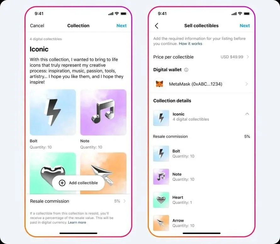 NFT 退烧 Meta 赶潮 扎克伯格斥巨资打造元宇宙,最不缺的就是争议。 支出巨大、股价下跌、回报甚微,VR 社交平台连自家员工也不想玩,投资者的抱怨声声入耳,旁观者依旧对元宇宙的定义困惑不已。 现在,Meta 旗下的 Instagram,又要走上另一条荆棘丛生的路,完善元宇宙不可缺失的一块拼图——NFT。 NFT 工具包,Instagram 放大招 近日,Meta 搞了个关于 NFT 的大动作:创作者们将能在 Instagram 上制作自己的 NFT,并将其出售给平台内外的粉丝。 到时候,创作者们将拥有一个端到端的工具包,基本覆盖了整套流程,从 NFT 的创建(首先支持 Polygon 区块链),到 NFT 的展示和销售。 NFT 被转售时,创作者也可以获得分成,比例从 5% 到 25% 不等。