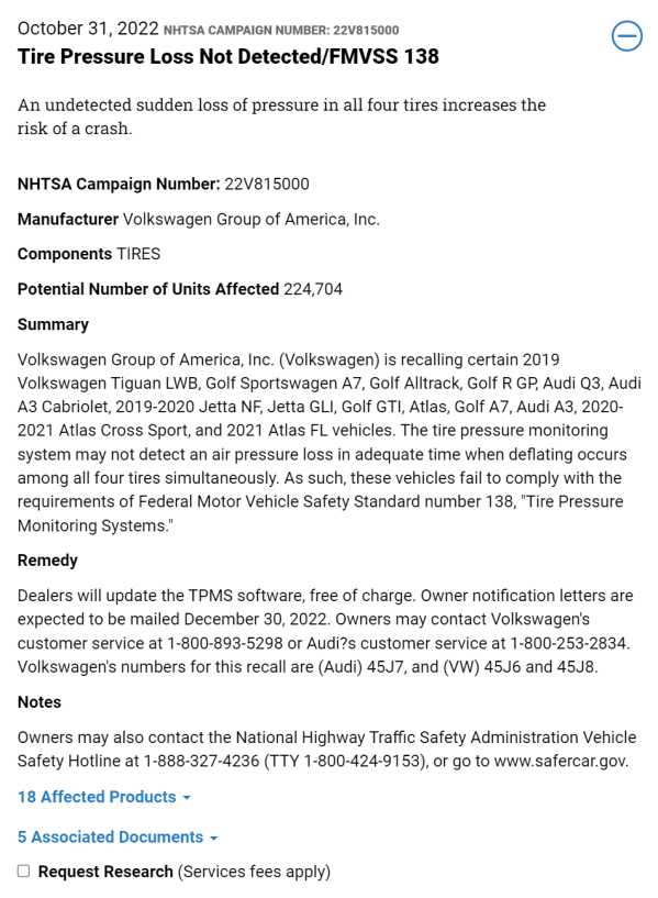 近日,据外媒报道,大众集团在美发布了召回计划,宣布将召回224704辆汽车,这些车型的胎压传感器可能存在有故障,在部分情况下可能会出现失灵的现象。 大众捷达 大众在相关召回公告中表示,此次召回主要涉及2019年-2021年生产的部分车型,包括大众高尔夫、大众途观、大众捷达、大众阿特拉斯(Atlas)等,此外,大众集团旗下的奥迪也不幸中招,包括奥迪Q3、奥迪A3等也在此次召回车型之列。大众表示,这些车型可能有故障传感器,在一些特定情况下可能不会记录胎压异常现象。因此,这些车辆不符合美国国家公路交通和安全管理局(NHTSA)的机动车辆安全标准。 NHTSA相关召回公告 大众在相关说明中没有提到与问题相关的可能出现轮胎损坏或爆胎的情况,而是强调传感器如何检测这种情况。但是大众在给NHTSA的一封信中表示,这个问题不会构成不合理的安全风险,因为轮胎遭到穿刺或者存在缓慢漏气的情况,传感器都会有检测到。大众在召回公告中进一步解释道:“当所有四个轮胎同时发生放气时,车辆的的胎压监测系统(TPMS)可能无法在足够的时间内检测出车辆胎压变化。”不过对于一般车主而言,四个轮胎同时出现漏气这一情况发生的可能性很小,不过根据法规,这些车辆还是需要进行召回。 据分析,出现这一故障的原因很可能是车辆的软件系统出现了问题,因此届时大众只需要对TPMS进行简单的软件更新就能解决这一故障。据悉,大众将会在12月之前通知到受影响的车主,车主只需前往当地经销商处进行相应升级即可。